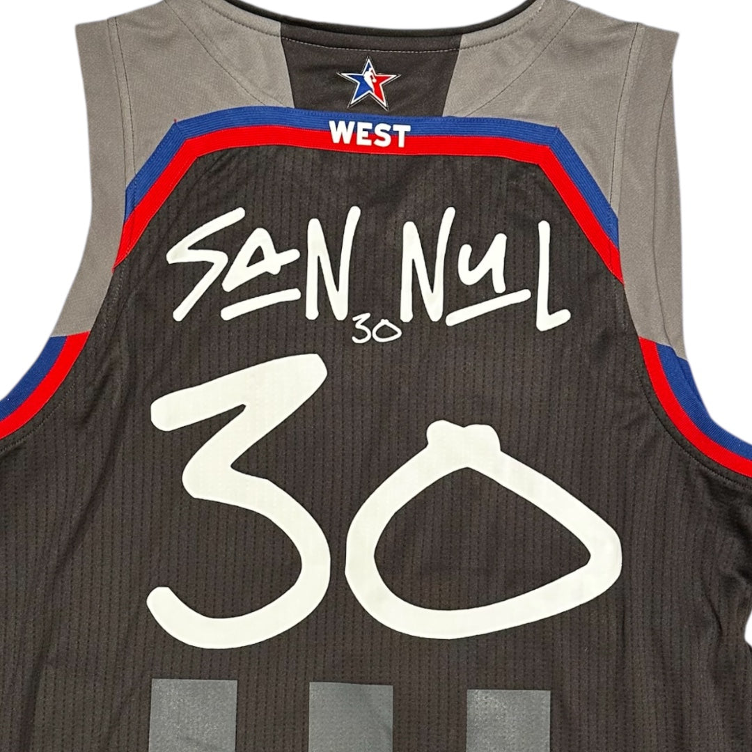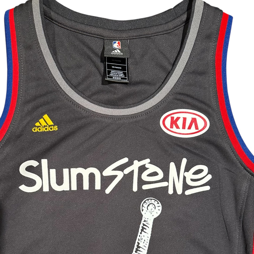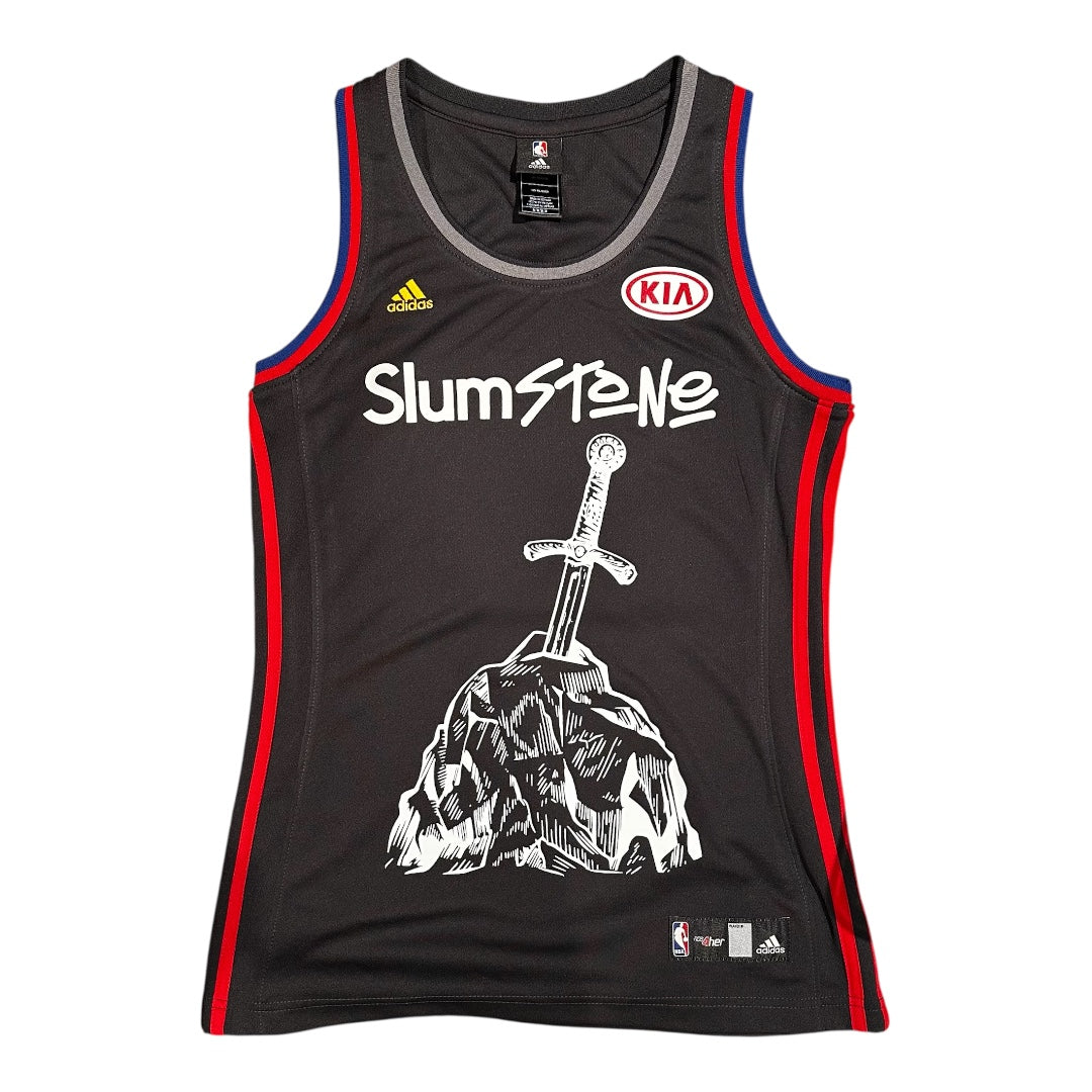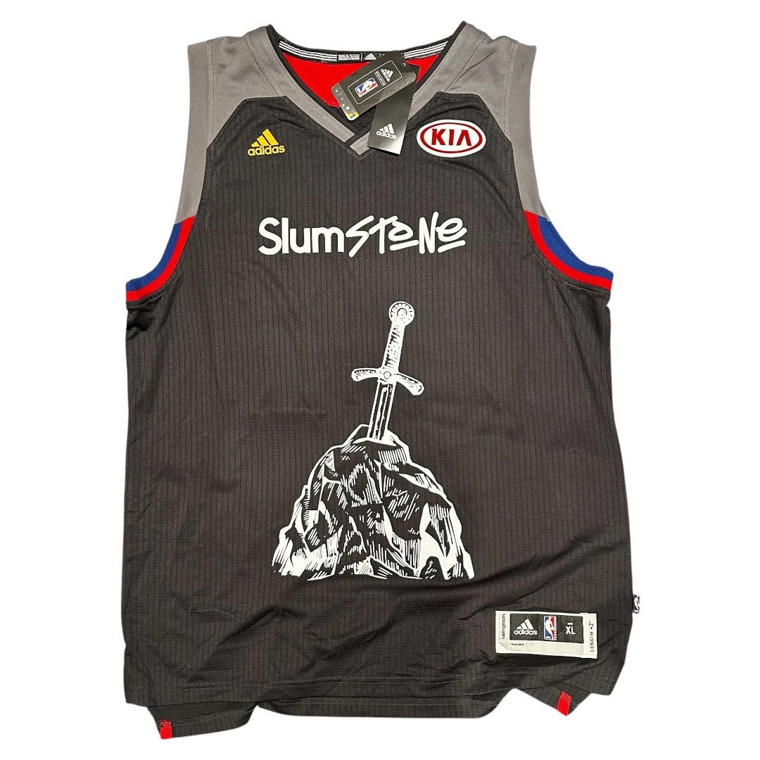 San Nul x Slumparadise NBA Adidas Jerseys. Adidas and Kia logo along front. Slumstone logo on chest, sword in stone graphic on front. San Nul 30 back. Red and blue detailing along back and shoulders.