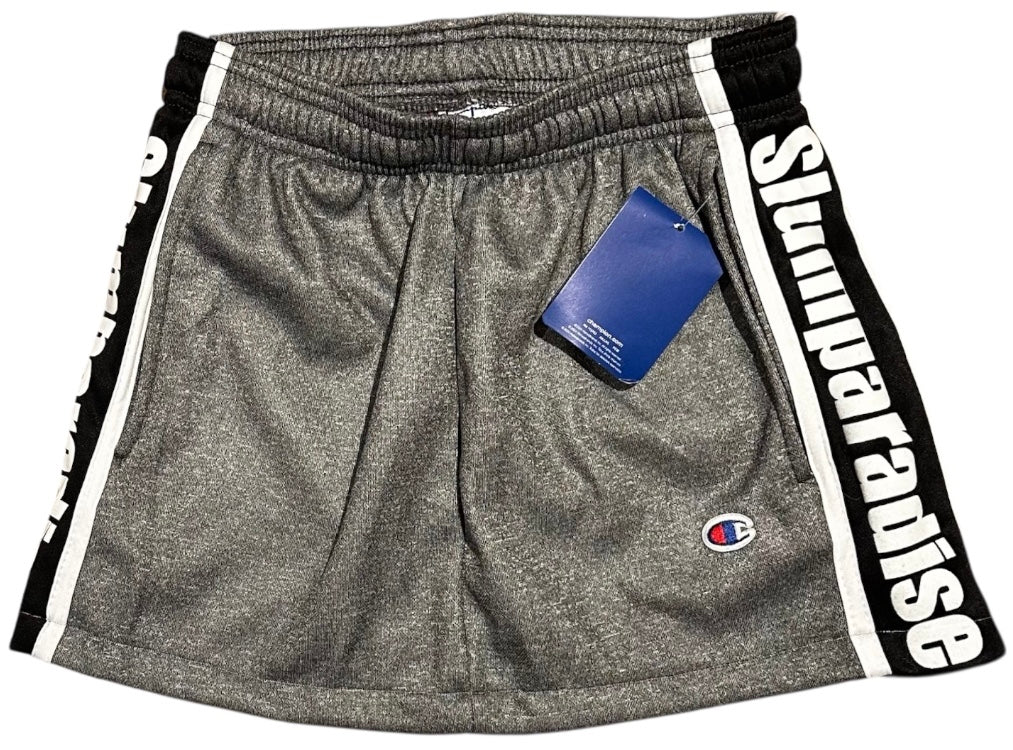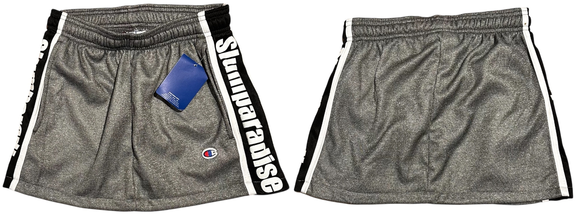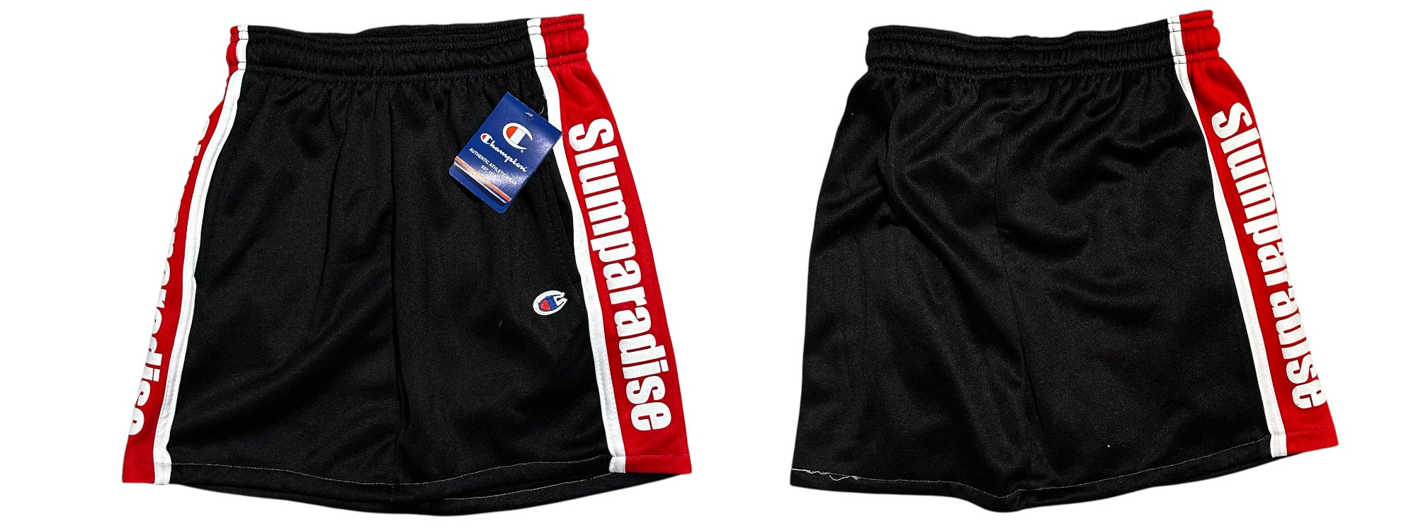 We Reworked men’s joggers into women’s skirts with pockets. Two Slumparadise logos along side panels.
